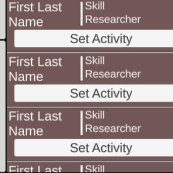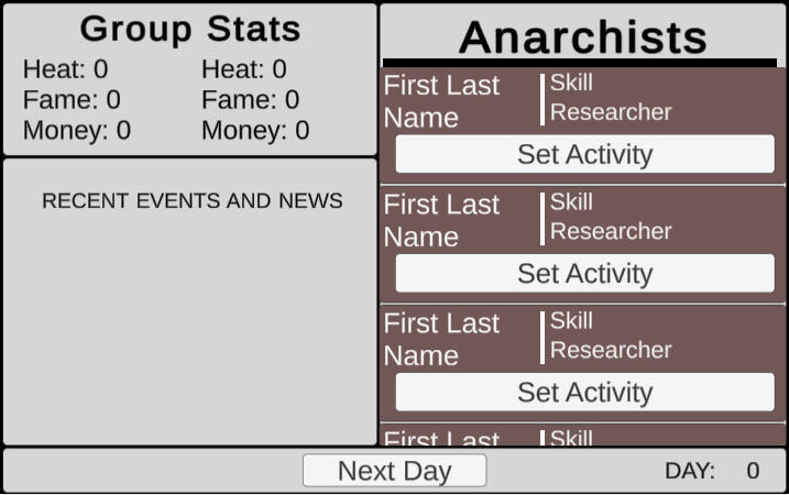 An squad management RPG game inspired by Oubliette (1983) and Liberal Crime Squad (2002). The player manages a squad of anarchists in the early 1900s. Players work jobs to buy materials to spread anarchism through conversing with the local populace and bombing politician's houses.This is still being developed over time.Sole game designer, UI/UX designer, and programmerThe game's main progression is done entirely through the UI to plan out actions, as well as control character choices. This was a new experience to me so the planning of player actions and the flow of gameplay in terms of menus and ease of use, while of course placing player enjoyment at the forefront is definitely a skill I am becoming more comfortable with.